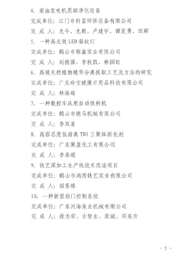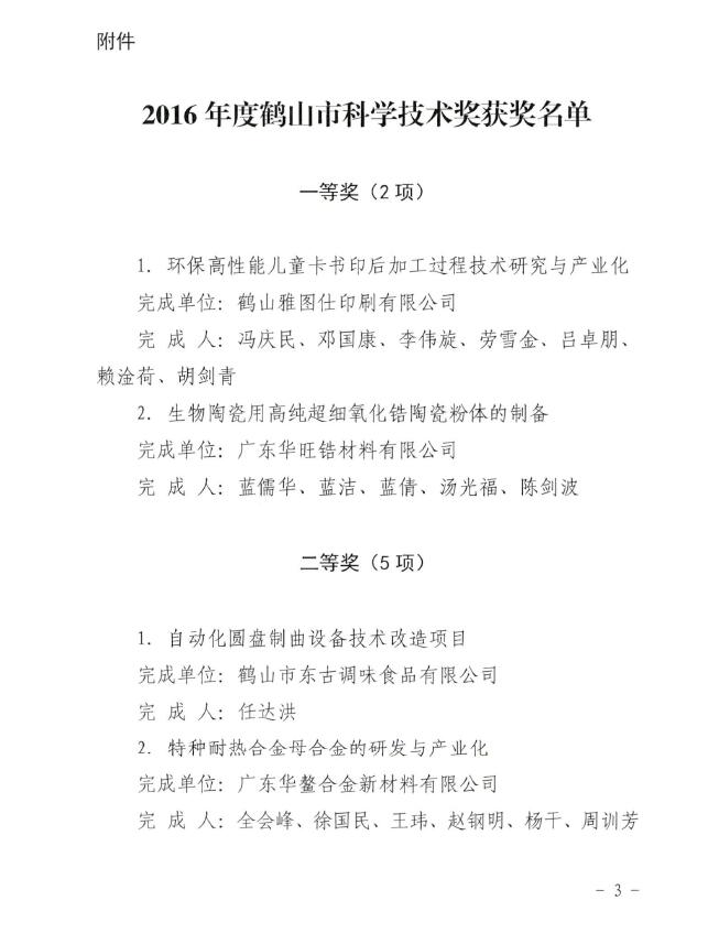 荣获“2016年鹤山市科学技术奖三等奖”