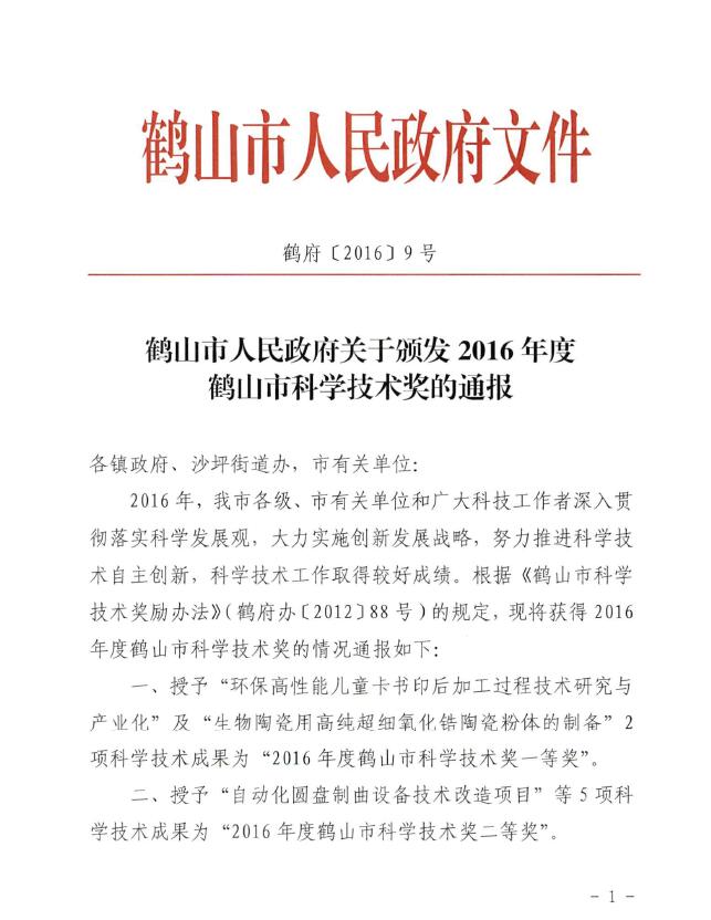 2016年,我单位和广大科技工作者深入贯彻落实科学发展观,大力实施创新发展战略,努力推进科学技术自主创新,科学技术工作取得较好的成绩,本公司于2016年11月获得“2016年鹤山市科学技术奖三等奖”!对于未来,公司将投入更大的人力物力进行研发、创新工作,不断提高企业的技术水平。