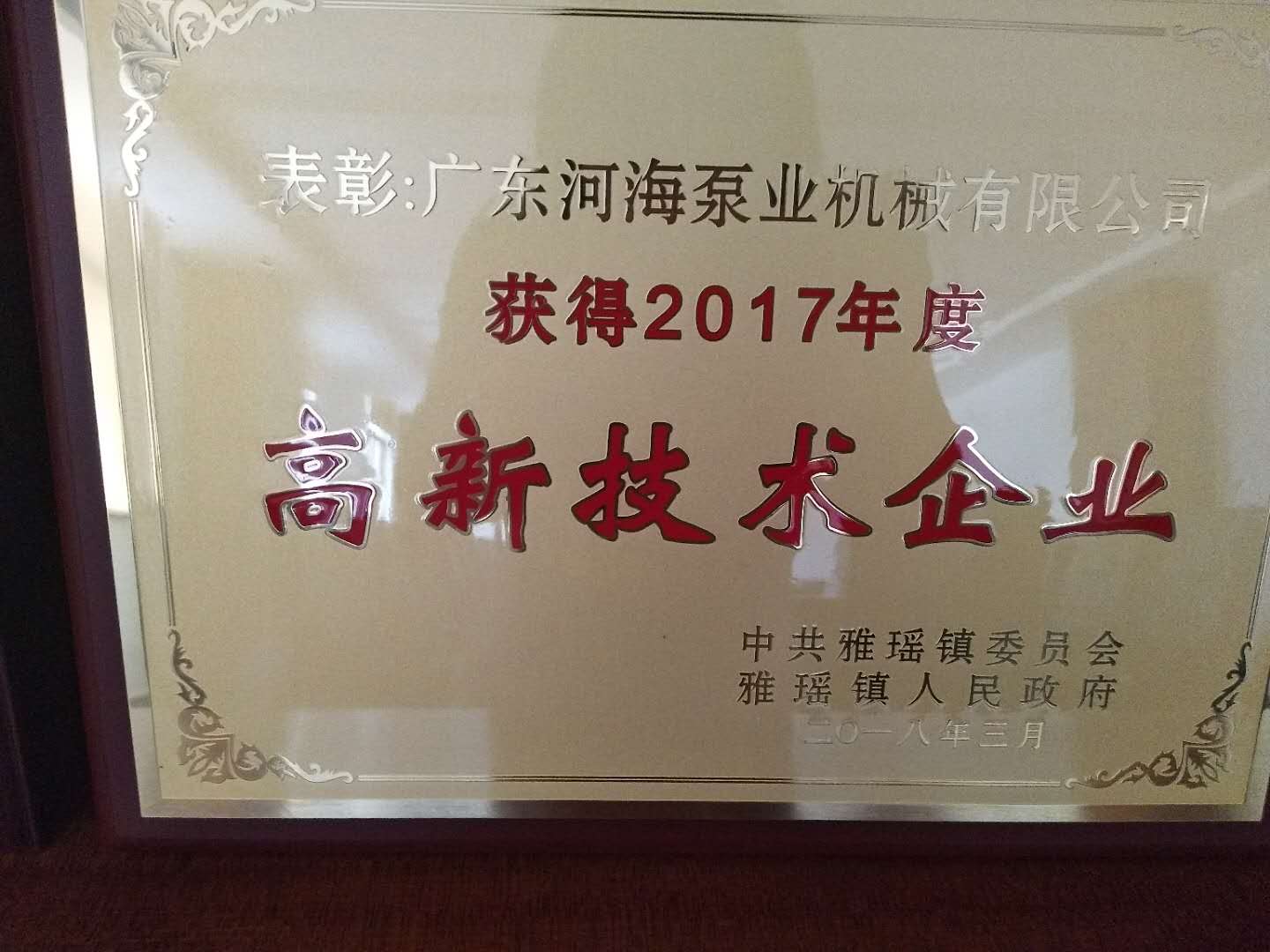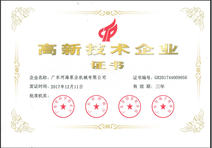 根据国家高新技术企业认定要求,我司2016年开展申报工作,经过资料提交、专家评审、财税部门会审、社会公示等环节严格审查之后,我公司顺利荣获了由广东省科学技术厅、广东省财政厅、广东省国家税务局、广东省地方税务局联合颁发的“高新技术企业”证书,广东河海泵业机械有限公司也成为了高新技术企业梯队的一员。