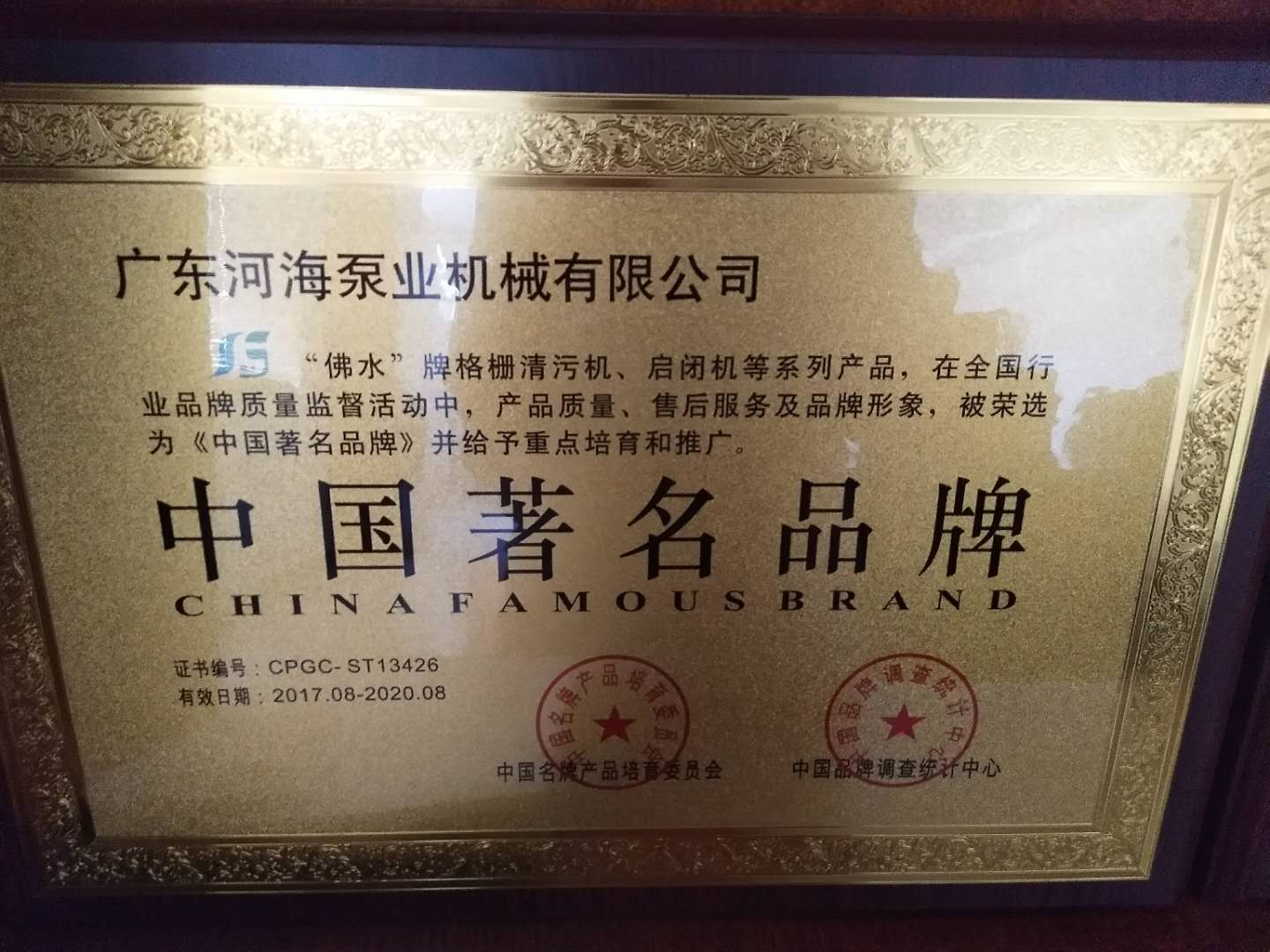 热烈庆贺广东河海泵业机械有限公司旗下产品“佛水”牌格栅清污机,启闭机等系列产品,在全国行业品牌质量监督活动中,产品质量、售后服务,及品牌形象,被荣选为《中国著名品牌》并给予重点培育和推广。