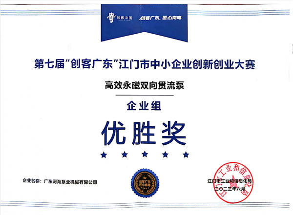 2023年第七届“创客广东”高校永磁双向贯流泵-企业组-优胜奖
